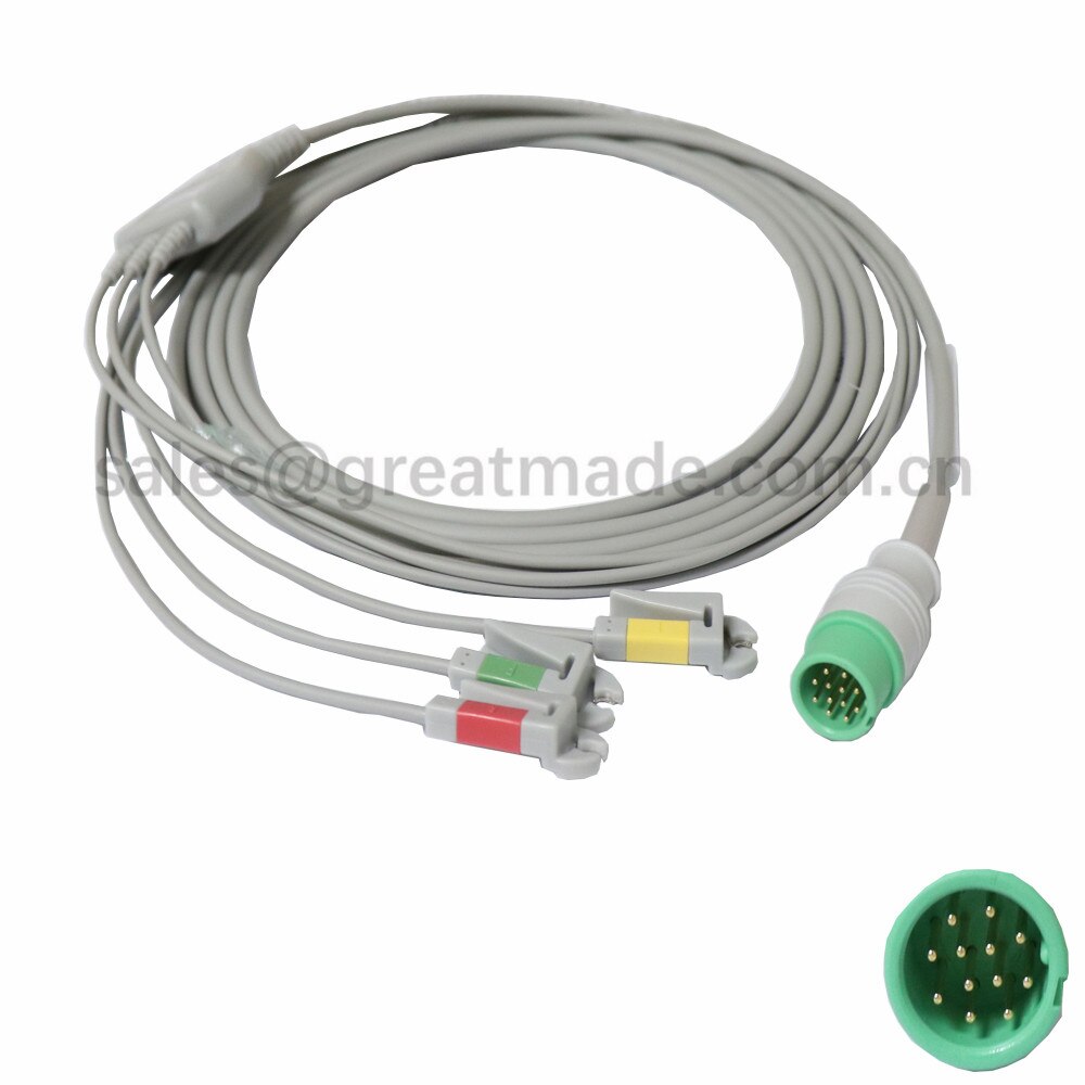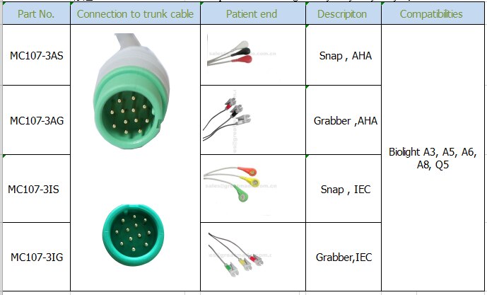 Cebl Cydnaws Biolight A3, A5, A6, A8, Q5 ECG gyda leadwiresie. IEC, 3-Plwm, grabber, gwyrdd 12pin