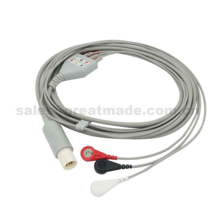 Cebl ECG Un Darn gyda Leadwires 3-Plwm Yn Cyd-fynd â Hellige SCP 844, SCP 851, SCP 852, SCS 804 ar gyfer Monitor Cleifion, AHA, Snap