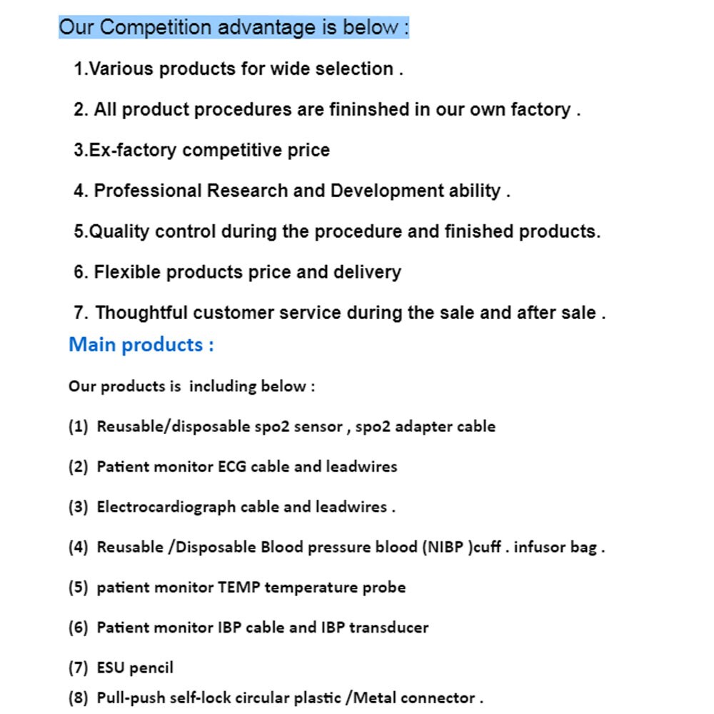Mae Shenzhen Greatmade Tech LTD yn wneuthurwr proffesiynol cebl meddygol, a ddefnyddir yn helaeth gyda monitor cleifion aml-baramedr, ocsimedr curiad y galon, dyfais EKG, montior pwysedd gwaed, uned electrofasgwlaidd. Mae gennym 10 mlynedd o brofiad yn y maes hwn. Mae gennym ein ffatri ein hunain yn Shenzhen China Mainland, ac mae gennym ddyfais weithgynhyrchu gyflawn a dyfais brawf. Rydym hefyd yn adeiladu tîm Ymchwil a Datblygu proffesiynol i fodloni amrywiol anghenion y farchnad. Mae ein safon uwch, ein pris manteisiol a'n gwasanaeth meddylgar wedi ennill cefnogaeth barhaol ein cwsmeriaid cenedlaethol a rhyngwladol.